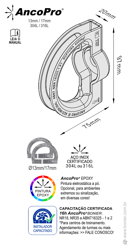 ANCORAGEM PROFISSIONAL Projetada para uso individual, içamento de cargas e resgate, a AncoPro®BONIER atende e supera todas as exigências impostas pelas Normas NR18 / NR35 e NBR 16325- 1e 2.