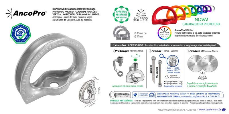 A Ancoragem Predial AncoPro® pode ser instalada, testada identificada e liberada para diferentes aplicações. Para uso individual ou coletivo -através de projeto linhas de vida- içamento de cargas ou dedicadas unicamente para resgate, cada AncoPro® carrega além da responsabilidade, o Certificado de Qualidade e o peso da marca Bonier Equipamentos de Segurança.