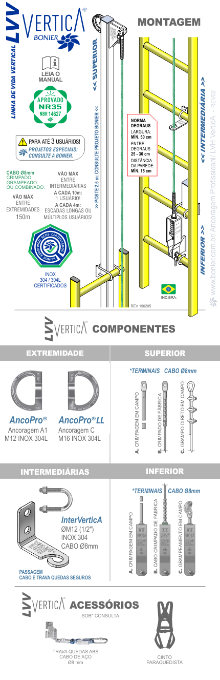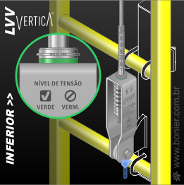 Fabricada com aços Inox Certificados para alta resistência mecânica e química a LVV VerticA está em acordo com as normas NR35 e NBR14627. Possui indicador de tensão e ID. para Controle de Instalação integrados e 3 tipos de terminais para acoplamento de cabos (A. Crimpagem em campo, B. Crimpado de fábrica ou C. Grampeamento). Ancoragens Intermediária e Superior projetadas para maximizar a segurança nos trabalhos em altura complementam o kit LVV VerticA.