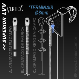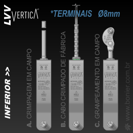 TERMINAIS LVV VerticA SUPERIOR Versatilidade de instalação através de 3 tipos de conexão INOX 304 CABO Ø8mm. Crimpagem em campo. Crimpado de Fábrica BONIER. Grampeamento direto em campo.​