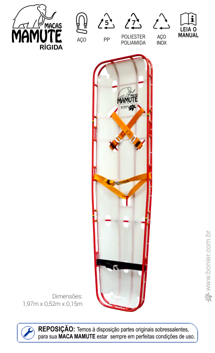 Para pronto atendimento, a estrutura super rígida MAMUTE® colabora para a estabilidade e proteção da vítima durante o transporte. Sejam situações normais ou extremas, sua construção reforçada e características especiais permitem manobras horizontais ou verticais com maior nível de confiabilidade. Seja por terra, água ou ar as MACAS MAMUTE® estão preparadas para qualquer situação.