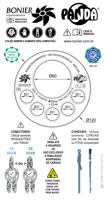Conexão e Compatibilidade BONIER®PANDA A utilização de Cordas com nó de arremate e Fitas compatíveis em acordo com SPIQ (Sistemas de Proteção Individual Contra Quedas) é obrigatória na montagem do sistema e fundamental para a segurança de todos.