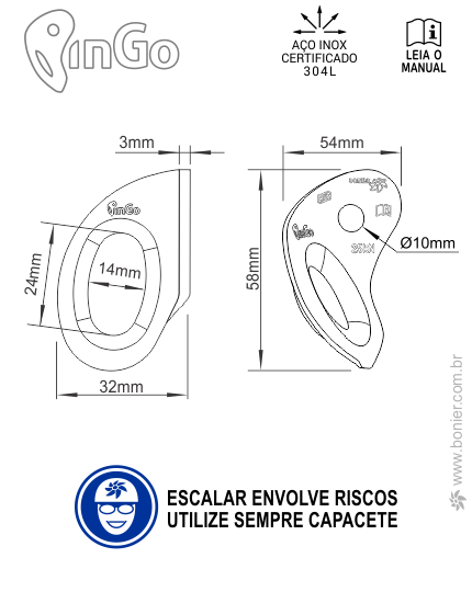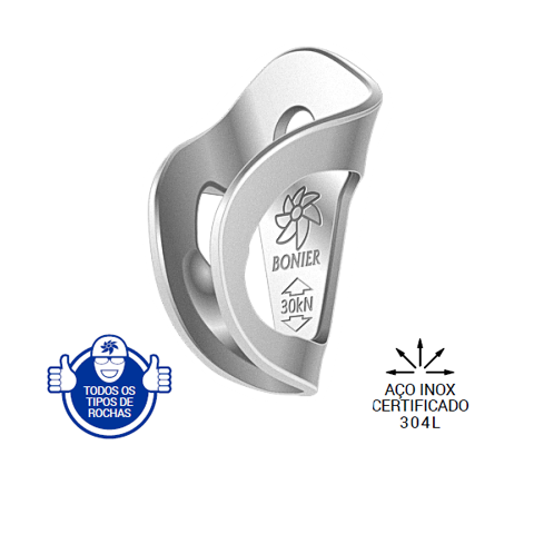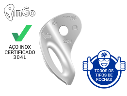 ABA ARREDONDADA: O encaixe perfeito PinGo reduz o desgaste de mosquetões e permite passagem de cordas sem rupturas nem danos ao material.