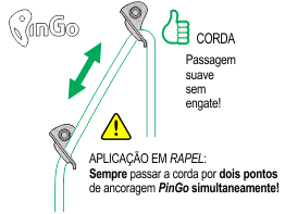 RAPEL PinGo: Passagem suave da corda sem risco de engate. Utilizar sempre simultaneamente no mínimo dois pontos de ancoragem PinGo*. ATENÇÃO LEIA O MANUAL! UTILIZE APENAS CORDA DINÂMICA!