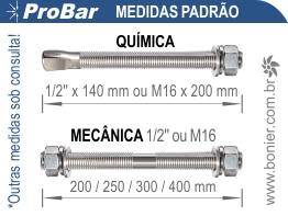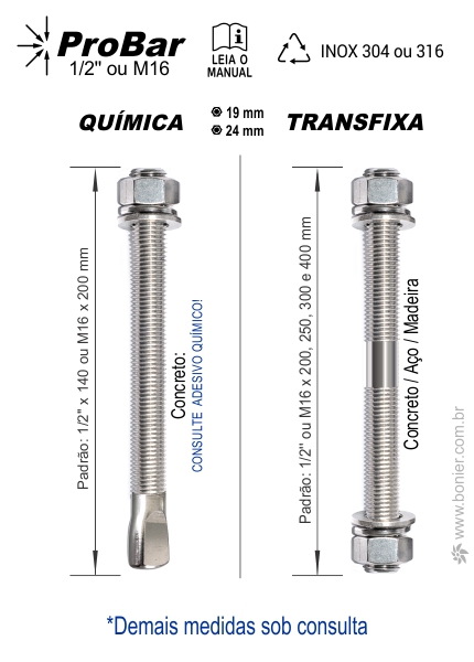 Para instalação por Fixação Química ou Transfixação Mecânica, a ProBar possui dois diâmetros compatíveis com AncoPro® Ø13 e 17 mm, e em cinco comprimentos padrão. Para demais medidas e maior segurança, consulte-nos.