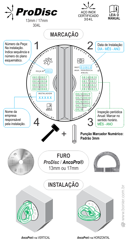 ProDisc INSTALAÇÃO E INSPEÇÃO PERIÓDICA ANUAL A gravação manual permanente e indelével com sinete 4mm assegura o controle e rastreamento individual de cada ponto de ancoragem AncoPro®.