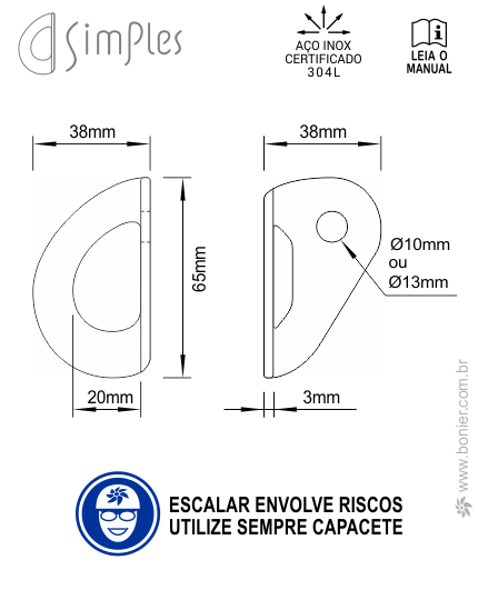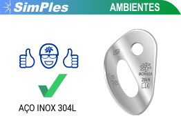 Resistente, eficiente e de fácil instalação, a Chapeleta SimPles BONIER Inox304L, possibilita acomodar dois mosquetões com muita segurança. Dispositivo de ancoragem esportiva versátil, é utilizado para proteção de vias de escalada em todos os tipos de rochas e ambientes; sejam normais, marítimos ou corrosivos.